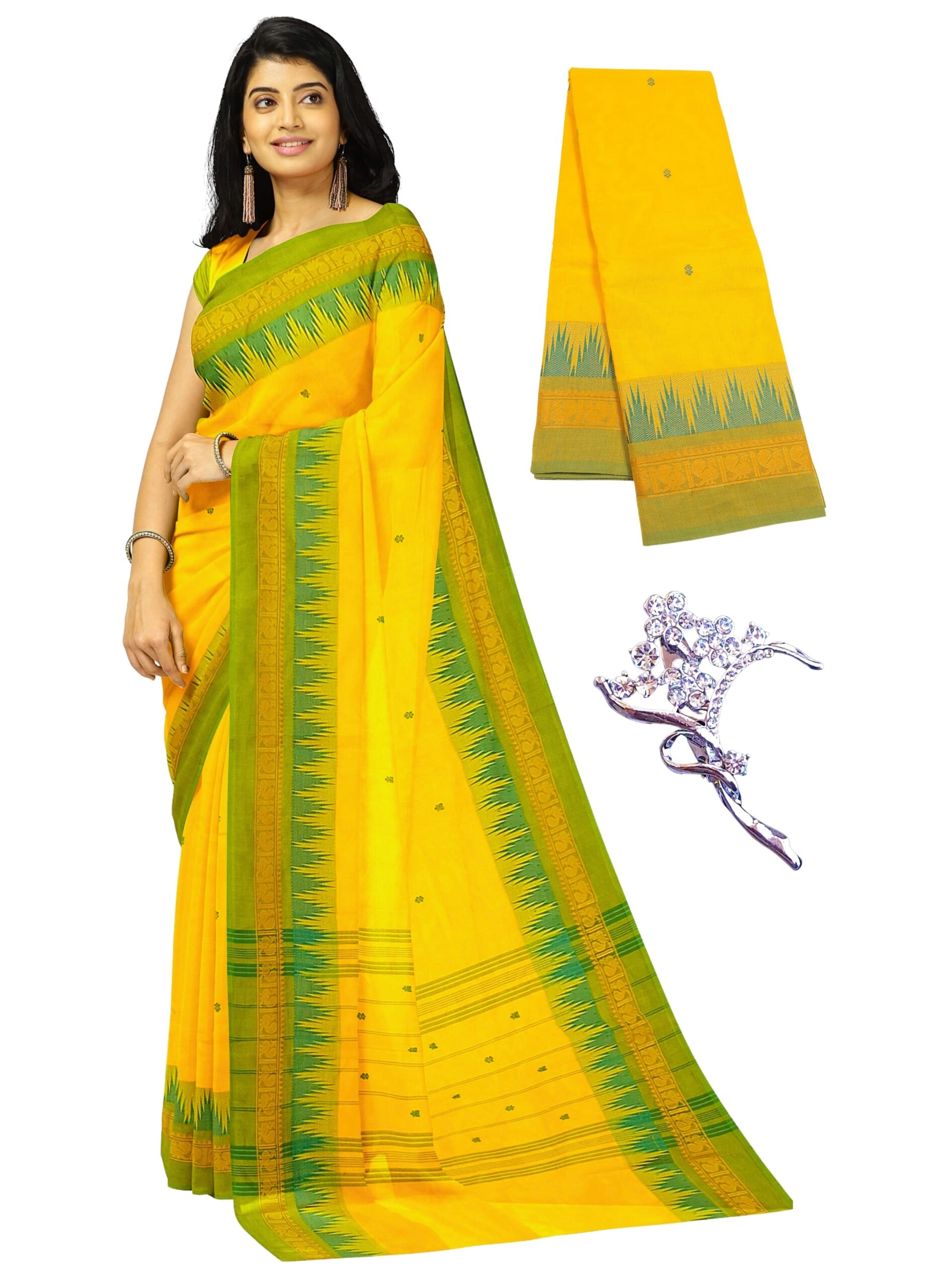 What You Get: 1 Cotton Saree with Running Blouse, 1 Assorted Saree Pin, 5 Safety Pins