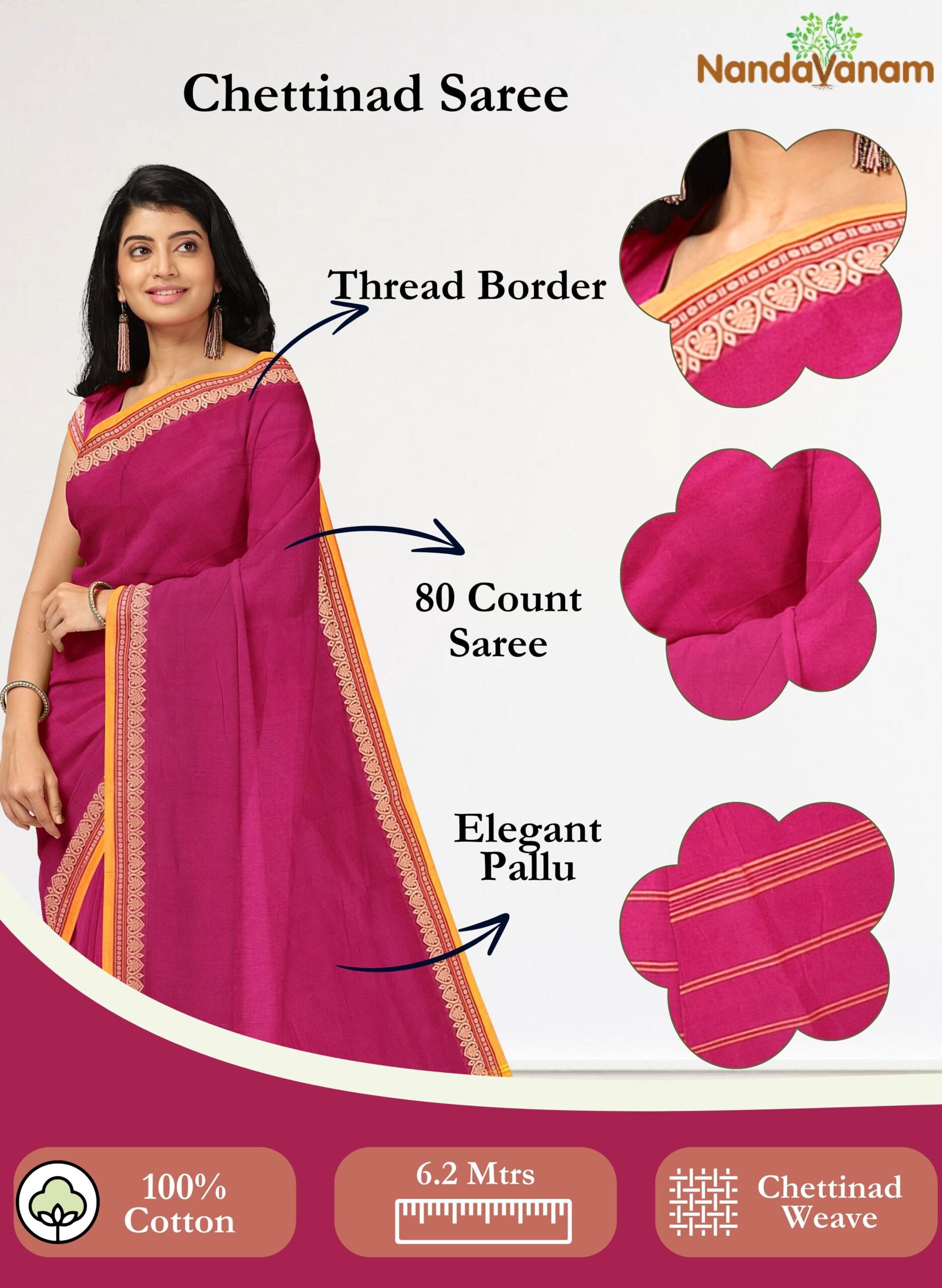 Authentic 80 Count Sarees With Blouse: Each Chettinad Pure Cotton Saree comes with a matching blouse and features the fine texture of 80 count cotton sarees, ensuring durability and style.