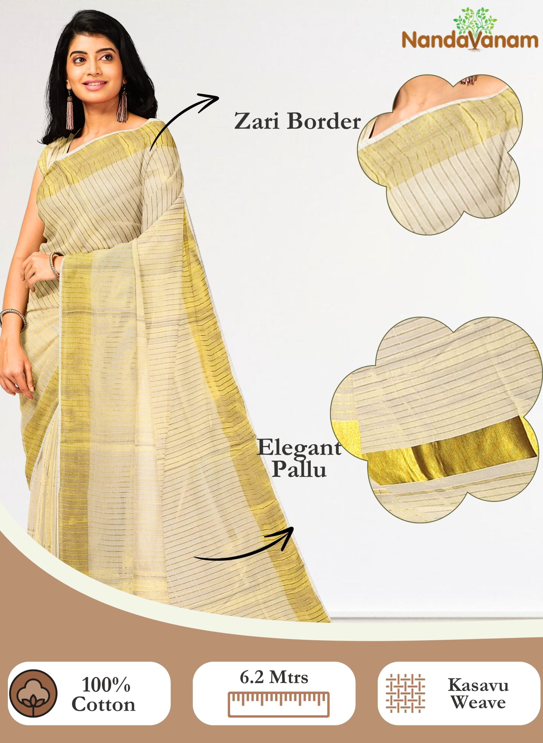 Step into the timeless elegance of Kerala tradition with the NandaVanam Women’s Kerala Kasuvu Sarees. Crafted meticulously, these sarees encapsulate the essence of Kerala’s rich cultural heritage. Woven from premium Kerala cotton, each drape tells a story of tradition and sophistication. The Kerala Kasavu Saree, a symbol of grace and beauty, is intricately designed with delicate kasavu borders, adding a touch of opulence to its simplicity.