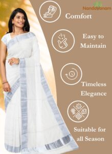 - Kerala Cotton Sarees: Lightweight and elegant, perfect for festive occasions like Vishu and Onam celebrations