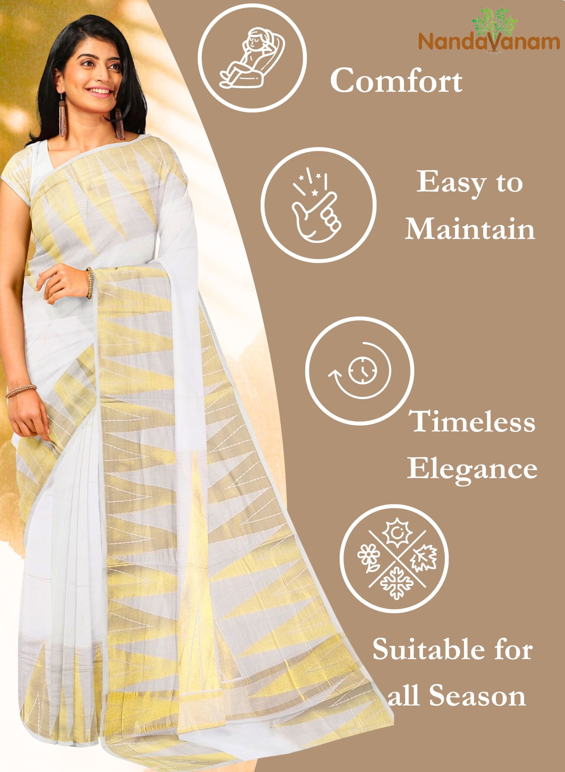 Discover the timeless elegance of Kerala’s traditional attire with Nandavanam’s exquisite Kerala Cotton Saree. Crafted with precision and care, this saree epitomizes the rich cultural heritage of Kerala, showcasing the intricate craftsmanship and fine detailing that have made Kerala sarees renowned worldwide. Made from the finest quality Kerala kasavu cotton, this saree exudes a luxurious feel and unparalleled comfort.