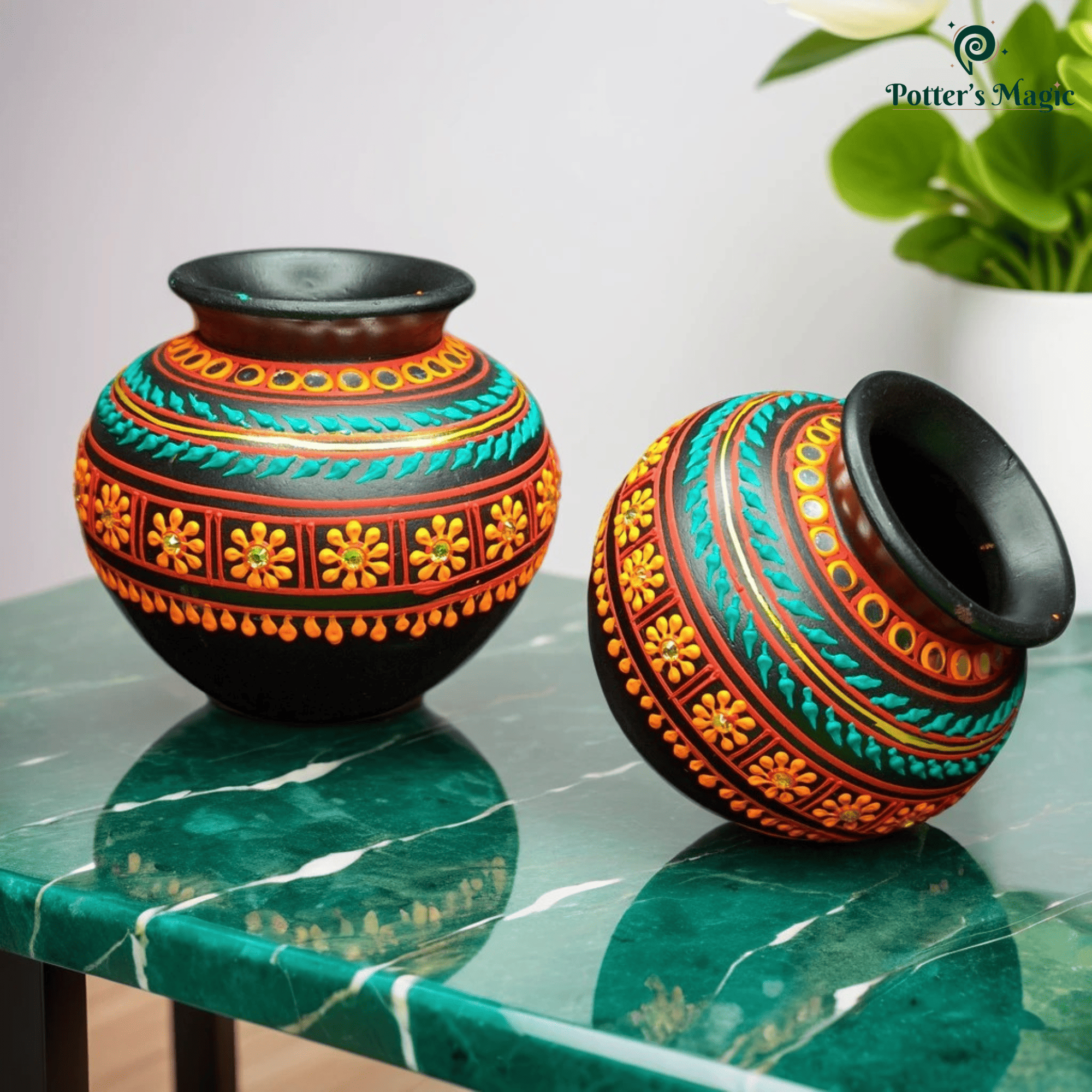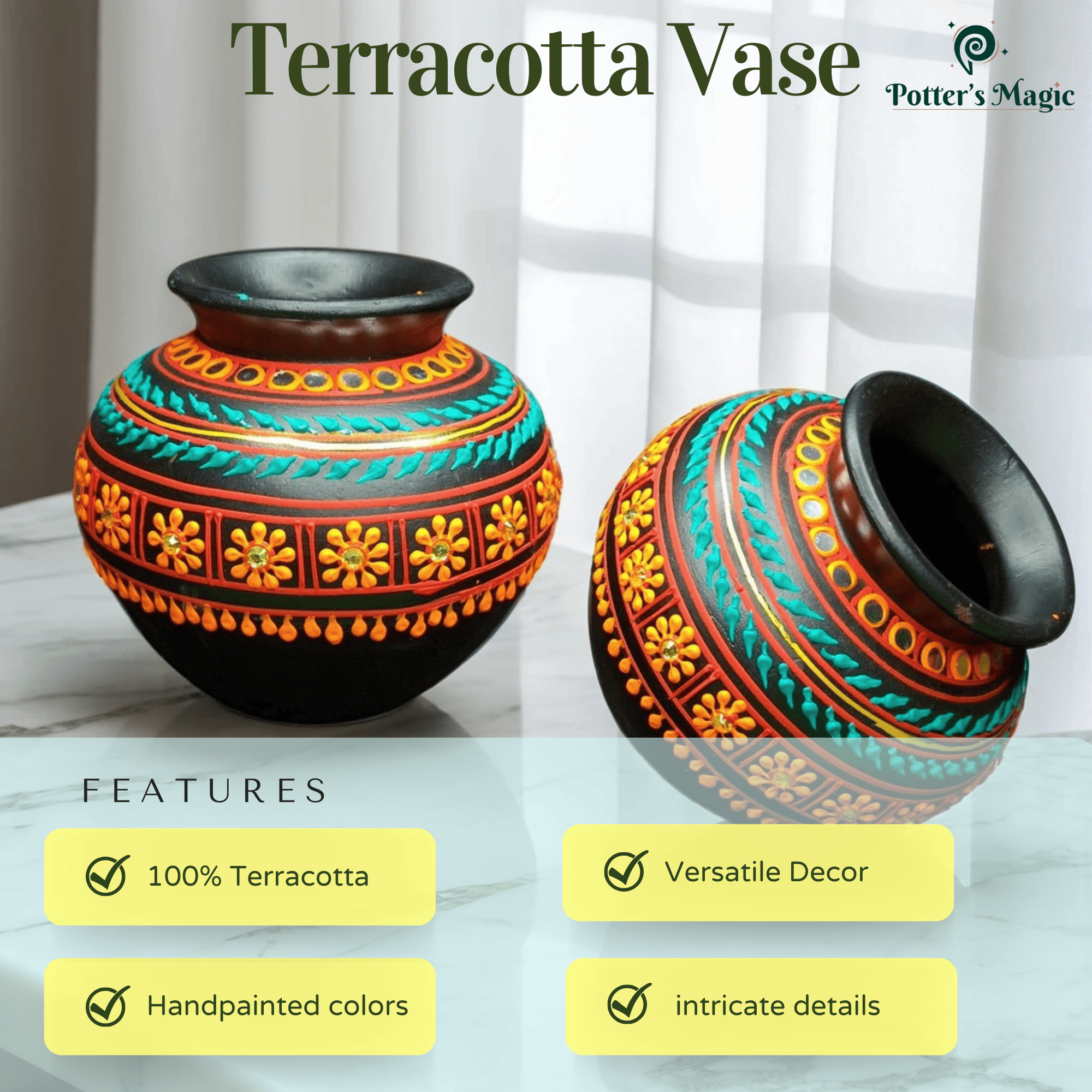 Potter’s Magic ‘Handpainted & Mirror Work’ Terracotta Flower Vase, Terracotta Decorative For Home Decor Earthen Flower Vases Pots For Home & Office (Set of 2)